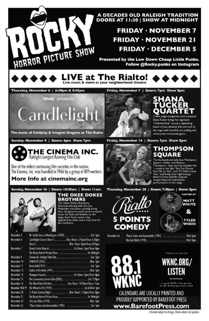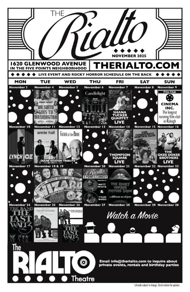 Check out the full calendar of EVERYTHING that’s coming your way at The Rialto in November. We look forward to seeing you for movies, comedy, music, and special events galore!Â